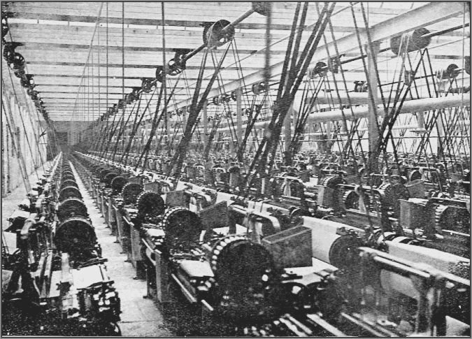 A spinning mule spins a length of thread at a time, with a frame moving towards the operator as the thread is spun, then back again as the thread is wound onto bobbins.